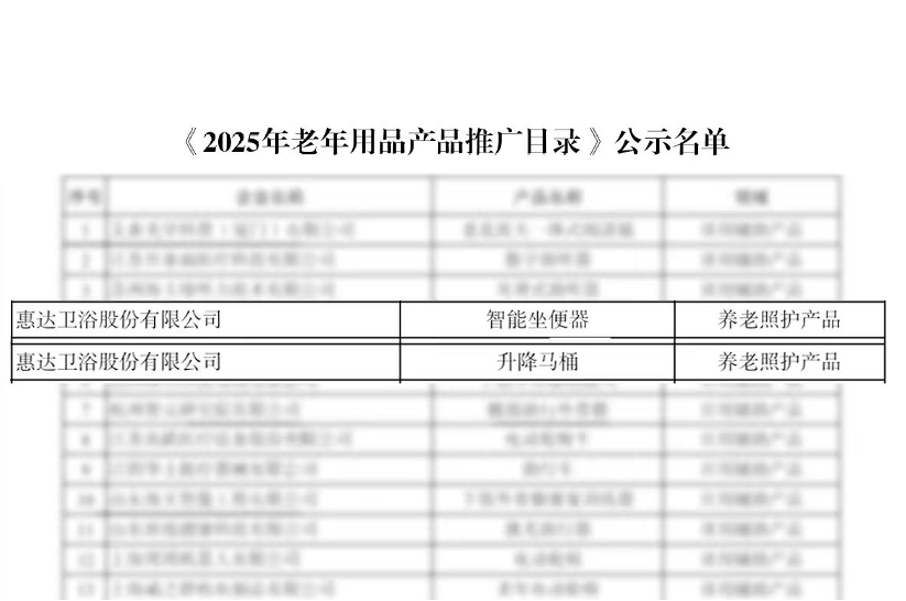 近日,国家工业和信息化部正式发布《2025年老年用品产品推广目录》,惠达卫浴(603385)凭借智能坐便器和升降马桶成功入选。这是继荣膺“亚洲品牌500强”这一重要行业奖项后,惠达再次获得的重要国家级认可,充分体现了其在产品研发、技术创新与人文关怀方面的综合实力。